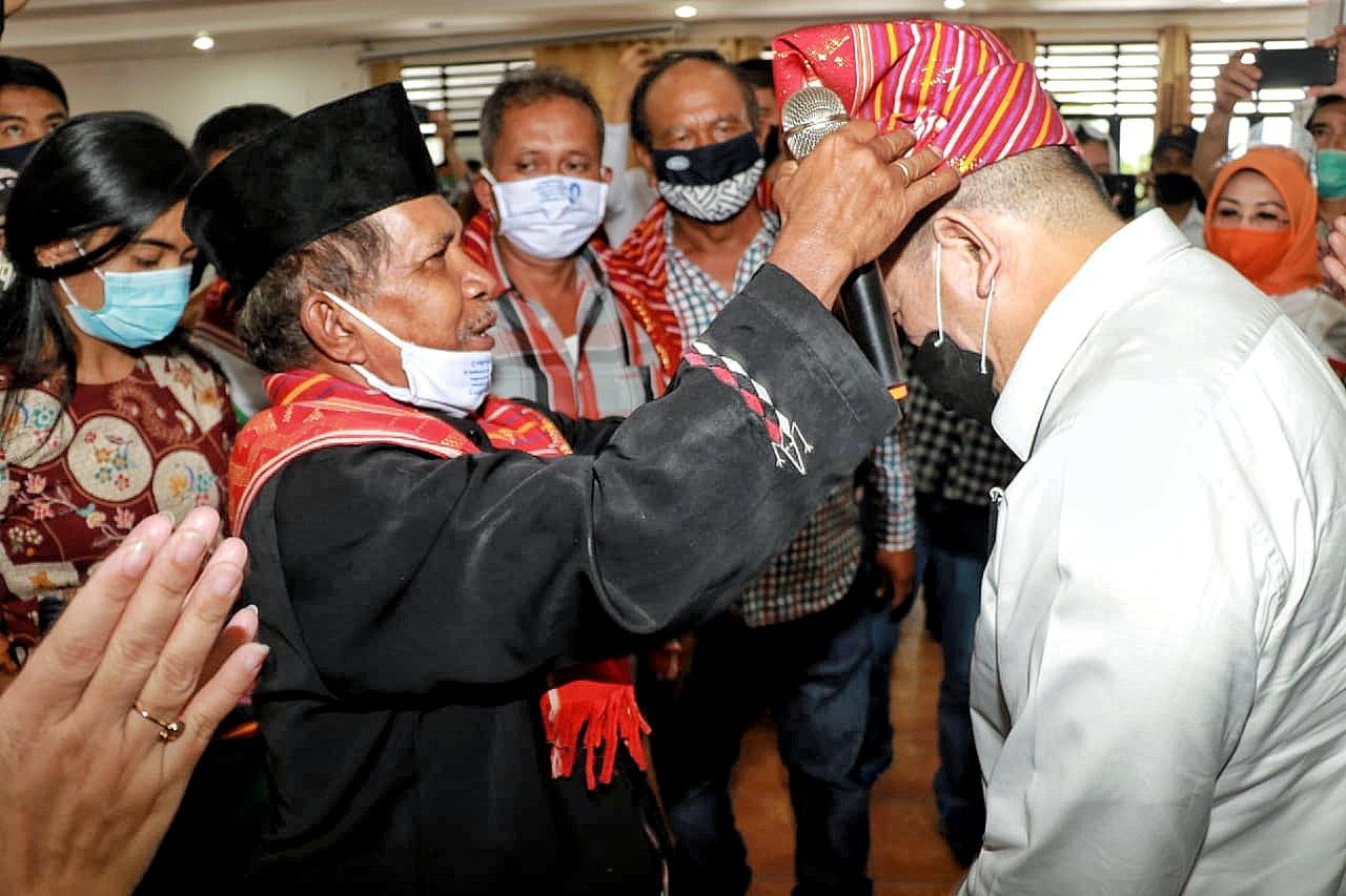 KABANJAHE,- Kunjungan kerja hari ketiga ke Kabupaten Karo, Ketua DPD RI AA LaNyalla Mahmud Mattalitti mendapat gelar marga Sitepu dari tokoh adat Karo, Malem Ukur Ginting. Pemberian marga tersebut dilakukan di aula kantor Bupati Karo, di Kabanjahe, Karo, Kamis (17/9/2020).