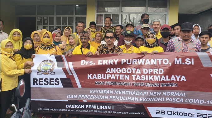 KAB. TASIKMALAYA, – Anggota DPRD Kabupaten Tasikmalaya Drs.Erry Purwanto M.Si laksanakan kegiatan reses masa sidang 1 tahun sidang 2020/2021 Kesiapan menghadapi New Normal dan percepatan pemulihan ekonomi pasca covid-19 di Dapil 1 Kecamatan Sukarame, Singaparna, Mangunreja, Tanjungjaya, Sariwangi dan Cigalontang. Acara reses tersebut di selenggarakan di Kampung Tabrik Desa Jayaputra Kecamatan Sariwangi.