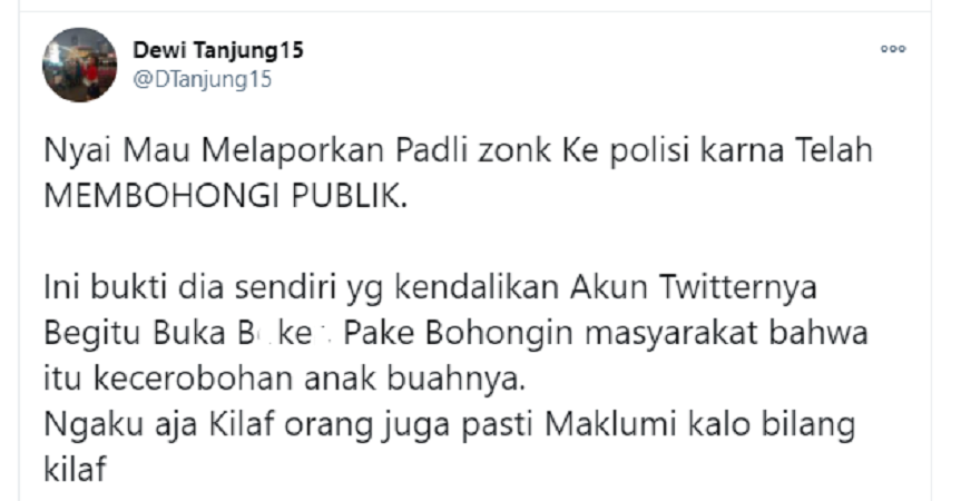 “Nyai Mau Melaporkan Padli zonk Ke polisi karna Telah MEMBOHONGI PUBLIK,” kata Dewi Tanjung.