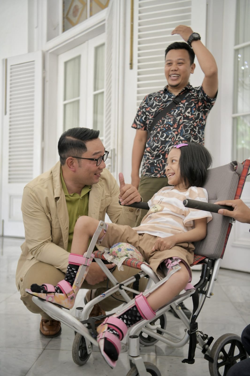 Ridwan Kamil sebelumnya menanyakan perihal sakit yang diderita perempuan tiga bersaudara tersebut. Reva, nama panggilannya, diketahui sejak lahir didiagnosa lemah otot yang membuatnya kesulitan berjalan normal seperti anak pada umumnya.