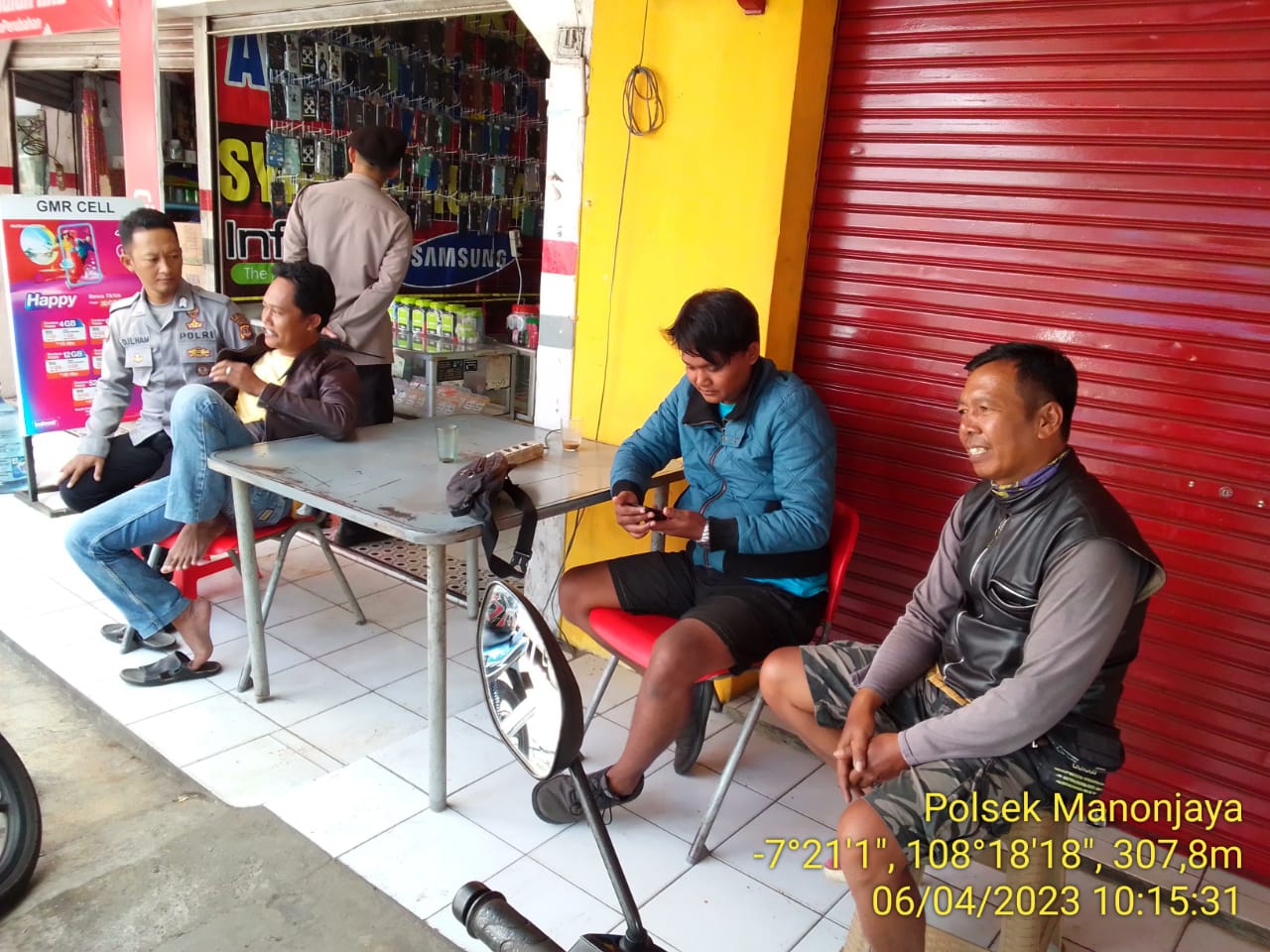 POLRES TASIK KOTA, || Bhabinkamtibmas Desa Margaluyu Polsek Manonjaya Polres Tasik Kota melaksanakan giat rutinitas menyambangi pertokoan pertokoan pasar kaler Manonjaya Kabupaten Tasikmalaya, Kamis (06/04/23).